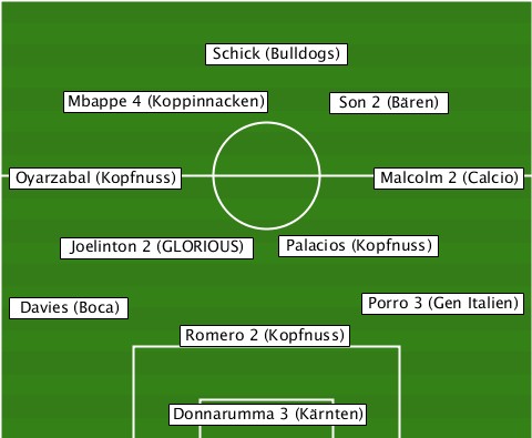 --------------Schick (Bulldogs)-- -----Mbappe 4 (Koppinnacken)-Son 2 (Bären) --Oyarzabal (Kopfnuss)---Malcolm 2 (Calcio) -----Joelinton 2 (GLORIOUS)-Palacios (Kopfnuss) --Davies (Boca)---------Porro 3 (Gen Italien) ------------Romero 2 (Kopfnuss)-- ------------Donnarumma 3 (Kärnten)
