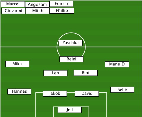 -------------Franco-------------- --Marcel-Angosom------------------ --Giovanni-Mitch-Phillip----------- ---------------Zaschka----------- ---------------Reini------------- ---Mika-------------------Manu D-- -----------Leo-----Bini----------- ---Hannes---Jakob---David----Selle-- --------------Jell---------------