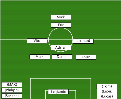 ---------------Mick-------------- ---------------Eric-------------- ---------Vito---------Lennard----- ---------------Adrian------------ ---------Mats---Daniel--Louis------ --(MAX)---------------------(Tom)- --(Philipp)----Benjamin------(Leon) --(Sascha)------------------(Lucas)
