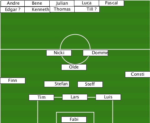 -----------------------Pascal---- --Andre-Bene--Julian-Luca----------- -Edgar ?-Kenneth ?-Thomas-Till ?---- -----------Nicki----Domme--------- ---------------Olde-------------- ----------------------------Consti -Finn-------Stefan--Steff---------- --------Tim-----Lars----Luis------- ---------------Fabi--------------