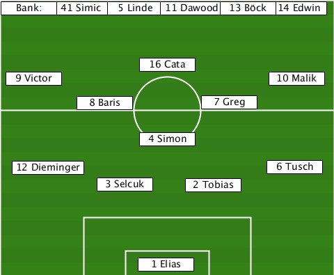 ---------------------------14 Edwin --Bank:-41 Simic-5 Linde-11 Dawood-13 Böck ---------------16 Cata----------- --9 Victor------------------10 Malik ---------8 Baris------7 Greg------ ---------------4 Simon----------- ---12 Dieminger-------------6 Tusch -----------3 Selcuk-2 Tobias------ ---------------1 Elias-----------