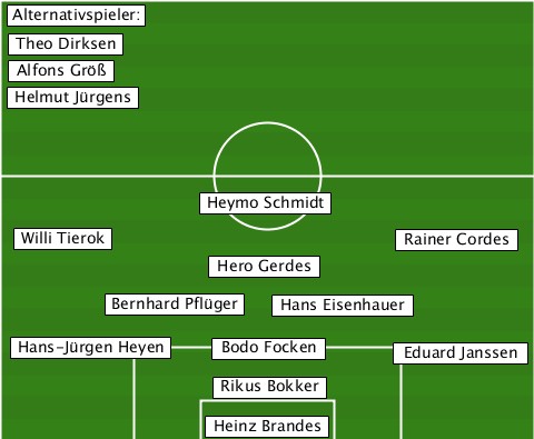 --Alternativspieler:------------- --Theo Dirksen------------------- --Alfons Größ-------------------- --Helmut Jürgens----------------- -------------Heymo Schmidt------- --Willi Tierok------------Rainer Cordes --------------Hero Gerdes-------- --------Bernhard Pflüger-Hans Eisenhauer --Hans-Jürgen Heyen-Bodo Focken-Eduard Janssen --------------Rikus Bokker------- --------------Heinz Brandes------