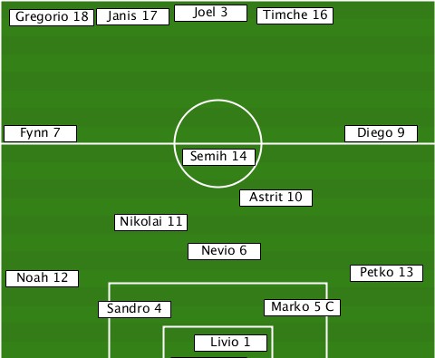 --------------Joel 3------------- --Gregorio 18-Janis 17-Timche 16--- --Fynn 7--------------------Diego 9 ---------------Semih 14---------- -------------------Astrit 10----- ----------Nikolai 11------------- ---------------Nevio 6----------- --Noah 12-------------------Petko 13 ---------Sandro 4-----Marko 5 C--- ----------------Livio 1----------