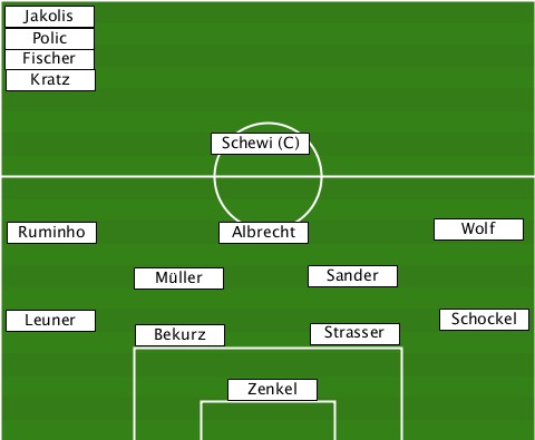 --Jakolis------------------------ --Polic-------------------------- --Fischer------------------------ --Kratz-------------------------- --------------Schewi (C)--------- --Ruminho-------Albrecht-----Wolf-- ---------Müller------Sander------- --Leuner---Bekurz-----Strasser-Schockel ---------------Zenkel------------