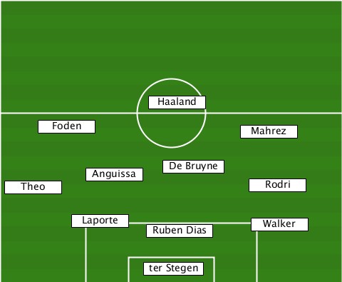 ---------------Haaland----------- -----Foden---------------Mahrez--- ---------Anguissa-De Bruyne------- --Theo--------------------Rodri--- --------Laporte-Ruben Dias-Walker-- ---------------ter Stegen--------