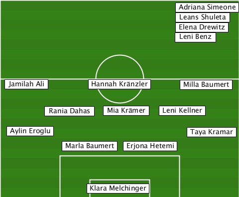 -------------------------Adriana Simeone -------------------------Leans Shuleta -------------------------Elena Drewitz -------------------------Leni Benz --Jamilah Ali-Hannah Kränzler-Milla Baumert -------Rania Dahas-Mia Krämer-Leni Kellner --Aylin Eroglu-------------Taya Kramar ----------Marla Baumert-Erjona Hetemi -------------Klara Melchinger----