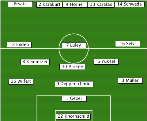 ---Ersatz------------------------ ---------2 Karakurt-4 Hörner-13 Karatas-14 Schweda ---12 Enden-----7 Luley------16 Selvi ------8 Kemnitzer------6 Yüksel--- --------------10 Arsene---------- ---15 Wilfert-9 Depperschmidt-3 Müller ---------------5 Gezer----------- --------------22 Knörnschild-----