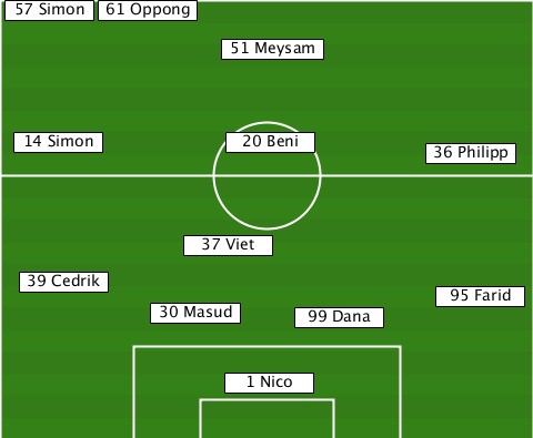 -------61 Oppong----------------- --57 Simon----------------------- ---------------51 Meysam--------- --14 Simon------20 Beni------36 Philipp ------------37 Viet-------------- ---39 Cedrik-----------------95 Farid ----------30 Masud--99 Dana------- ---------------1 Nico------------