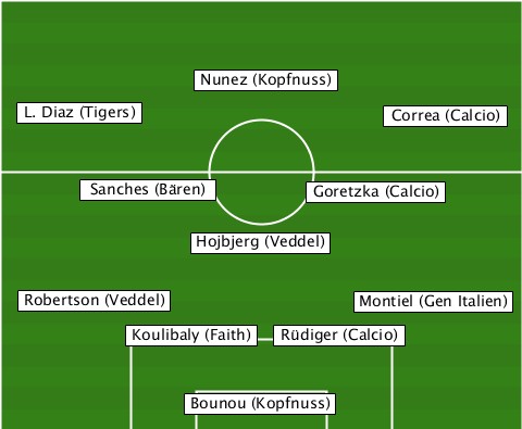 -------------Nunez (Kopfnuss)---- --L. Diaz (Tigers)--------Correa (Calcio) ------Sanches (Bären)-Goretzka (Calcio) -------------Hojbjerg (Veddel)--- ---Robertson (Veddel)---Montiel (Gen Italien) ---------Koulibaly (Faith)-Rüdiger (Calcio) -------------Bounou (Kopfnuss)---