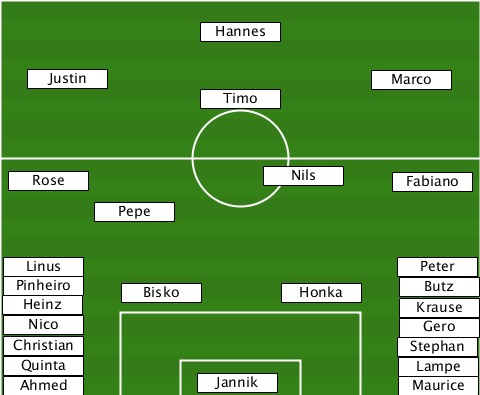 ---------------Hannes------------ ---Justin------------------Marco-- ---------------Timo-------------- --Rose--------------Nils------Fabiano --------Pepe--------------------- --Linus----------------------Peter --Heinz-Pinheiro-Bisko-Honka----Butz-Krause --Nico-----------------------Gero- --Christian------------------Stephan --Quinta---------------------Lampe --Ahmed---------Jannik--------Maurice