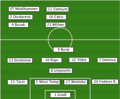 ----ET Mödlhammer---------------- --------------11 Fattoum--------- ----2 Dizdarevic-16 Cekic--------- ----4 Buzuk----21 Millner--------- ----------------9 Burai---------- ---13 Strommer-10 Rigo-12 Yildiz-7 Demitra ---------------8 Umprecht-------- ---15 Tarzi-5 Missi Tomp-17 Wodicka-20 Federer R. ---------------1 Gindl-----------