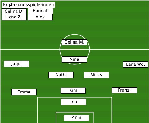 --Ergänzungsspielerinnen--------- --Celina D.-Hannah---------------- --Lena Z.-Alex-------------------- ---------------Celina M.--------- --Jaqui---------Nina----------Lena Wo. ------------Nathi---Micky--------- ----Emma-------Kim---------Franzi-- ---------------Leo--------------- ---------------Anni--------------