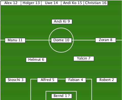 --Alex 12------------------------ -------Holger 13-Uwe 14-Andi Ko 15-Christian 16 ---------------Andi Ki 9--------- ---Manu 11------Dome 10-----Zoran 8 --------Helmut 6------Yalcin 7---- ---Stoschi 3-Alfred 5-Fabian 4-Robert 2 ---------------Bernd 1 ?---------