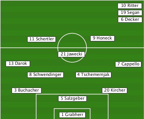 ----------------------------10 Ritter ----------------------------19 Segan ----------------------------6 Decker --------11 Schertler---9 Honeck--- --------------21 Jawecki--------- ---13 Darok-----------------7 Cappello --------8 Schwendinger-4 Tschemernjak ----3 Buchacher----------20 Kircher --------------5 Salzgeber-------- ---------------1 Grabherr--------