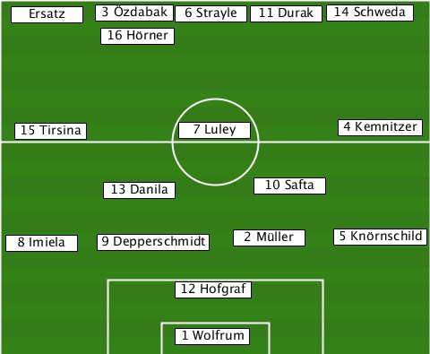 --------------------------14 Schweda --Ersatz--3 Özdabak-6 Strayle-11 Durak ---------16 Hörner--------------- ---15 Tirsina---7 Luley------4 Kemnitzer ---------13 Danila---10 Safta----- --8 Imiela-9 Depperschmidt-2 Müller-5 Knörnschild --------------12 Hofgraf--------- --------------1 Wolfrum----------
