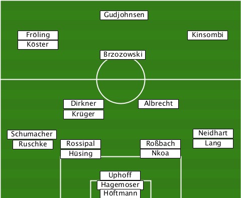 ---------------Gudjohnsen-------- ----Fröling----------------Kinsombi ----Köster----------------------- ---------------Brzozowski-------- ----------Dirkner----Albrecht----- ----------Krüger----------------- --Schumacher----------------Neidhart ---Ruschke-Rossipal---Roßbach-Lang-- ---------Hüsing------Nkoa--------- ---------------Uphoff------------ --------------Hagemoser---------- ---------------Höftmann----------