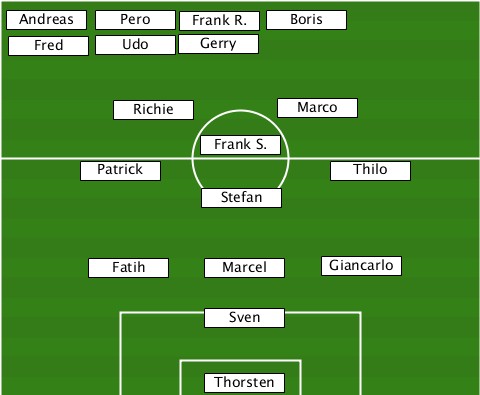 -------------------Boris--------- --Andreas-Pero-Frank R.------------ --Fred---Udo---Gerry--------------- ---------Richie------Marco-------- ---------------Frank S.---------- -------Patrick----------Thilo----- ---------------Stefan------------ -------Fatih----Marcel---Giancarlo- ---------------Sven-------------- ---------------Thorsten----------