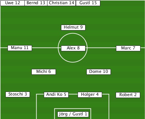-------Bernd 13------------------ --Uwe 12-----Christian 14-Gustl 15- ---------------Helmut 9---------- ---Manu 11------Alex 8-------Marc 7 --------Michi 6-------Dome 10----- ---Stoschi 3-Andi Ko 5-Holger 4-Robert 2 --------------Jörg / Gustl 1-----