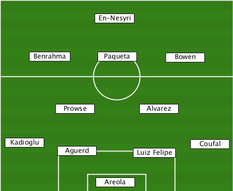 --------------En-Nesyri---------- -----Benrahma---Paqueta---Bowen---- ---------Prowse-------Alvarez----- --Kadioglu-Aguerd-----Luiz Felipe-Coufal ---------------Areola------------