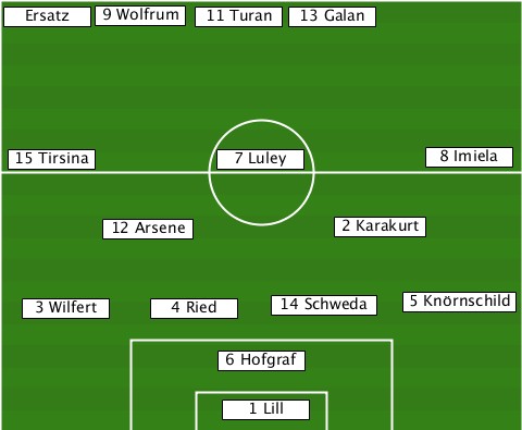 -------9 Wolfrum----------------- --Ersatz------11 Turan-13 Galan---- --15 Tirsina----7 Luley-------8 Imiela --------12 Arsene------2 Karakurt- ---3 Wilfert-4 Ried-14 Schweda-5 Knörnschild ---------------6 Hofgräf--------- ---------------1 Lill------------