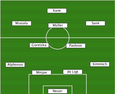 ---------------Kane-------------- -----MUSIALA----MÜLLER-----SANÉ---- ----------GORETZKA---Pavlovic----- ---Alphonso-----------------KIMMICH ----------Minjae----de Ligt------- ---------------NEUER-------------