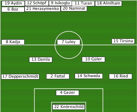 -------12 Schöpf----------------- --19 Aydin----9 Isikoglu-11 Turan-18 Almlham --6 Boz-21 Herasymenko-20 Naminat-- --8 Kadja-------7 Luley-------15 Tirsina --------13 Danila-----10 Güler---- --17 Depperschmidt-2 Fattal-14 Schweda-16 Ried ---------------4 Gezer----------- --------------22 Knörnschild-----