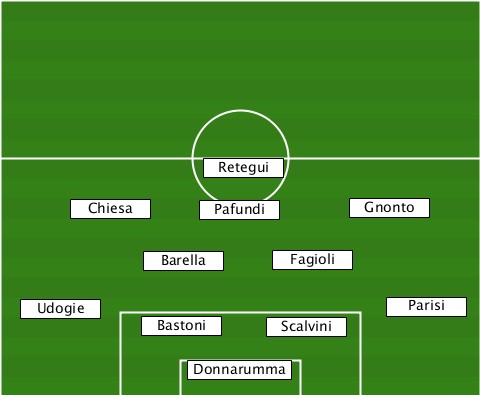 ---------------Retegui----------- ------Chiesa----Pafundi----Gnonto-- -----------Barella---Fagioli------ ---Udogie-------------------Parisi -----------Bastoni--Scalvini------ --------------Donnarumma---------