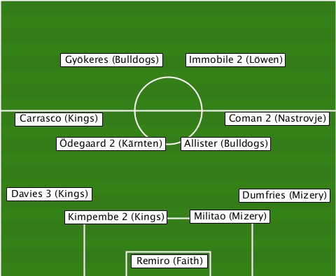 -------------------Immobile 2 (Löwen) -------Gyökeres (Bulldogs)------- ---Carrasco (Kings)-----Coman 2 (Nastrovje) -------Ödegaard 2 (Kärnten)-Allister (Bulldogs) --Davies 3 (Kings)-------Dumfries (Mizery) --------Kimpembe 2 (Kings)-Militao (Mizery) --------------Remiro (Faith)-----