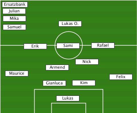 --Ersatzbank--------------------- --Julian------------------------- --Mika--------------------------- --Samuel--------Lukas O.---------- -------Erik-----Sami-----Rafael---- -------------------Nick---------- ------------Armend--------------- ---Maurice------------------Felix- -----------Gianluca-Kim----------- ---------------Lukas-------------